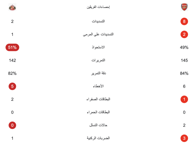 وجاءت إحصائيات المباراة لتشير إلى تفوق أرسنال على منافسه بشكل كبير حتى استحق الحصول على الأفضلية.