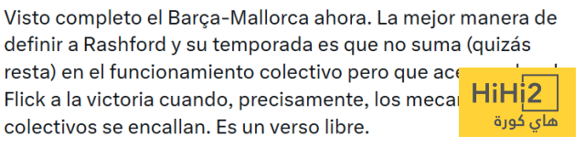 بعد مشاهدة مباراة برشلونة ومايوركا كاملة الآن ، يمكن وصف راشفورد هذا الموسم بأنه لا يضيف كثيرًا (وربما يضر أحيانًا) بالمنظومة الجماعية ، لكنه في المقابل يقرب فريق فليك من الفوز عندما تتعطل الآليات الجماعية تحديدًا .