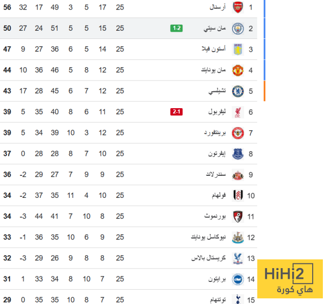 ترتيب الدوري الانجليزي بعد نهاية لقاء مانشستر سيتي وليفربول