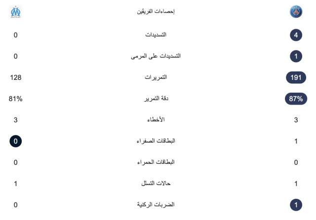 إحصائيات نصف ساعة من مباراة باريس سان جيرمان ومارسيليا