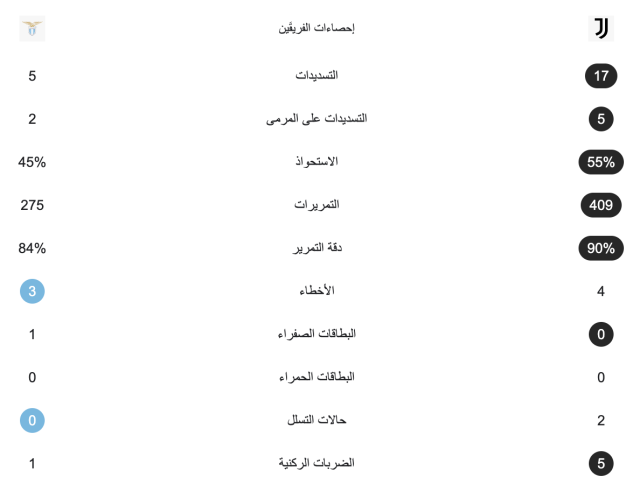 إحصائيات مباراة يوفنتوس ولاتسيو بعد مرور ساعة