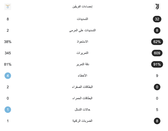 وبهذه النتيجة توقف رصيد يوفنتوس عند 46 نقطة في المركز الرابع بجدول ترتيب الكالتشيو، فيما أصبح رصيد لاتسيو 33 نقطة في المركز الثامن.
