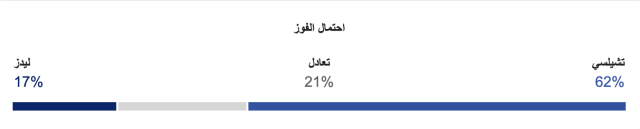 نسبة فوز تشيلسي 62%، ونسبة فوز ليدز يونايتد 17%، ونسبة التعادل 21%.
