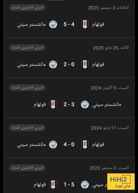إليكم نتائج أخر 5 مباريات جمعت مانشستر سيتي و فولهام :