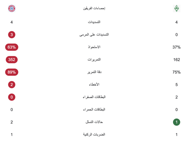إحصائيات الشوط الأول لمباراة بايرن ميونخ وفيردر بريمن