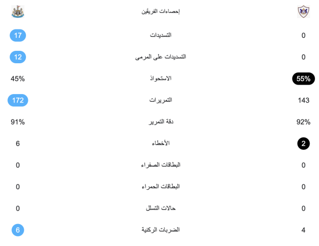 إحصائيات الشوط الأول لمباراة نيوكاسل يونايتد وقره باغ