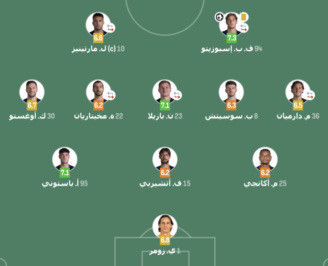وقدم لاعبو إنتر ميلان مباراة سيئة مما جعلهم يحصلون على تقييمات متوسطة من موقع سوفا سكور.