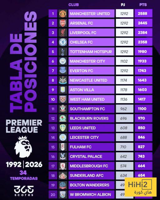 هاي كورة- يكشف ارشيف مسابقة الدوري الانجليزي الممتاز منذ اطلاقها عام 1992 عن تفوق واضح لأندية دائرة البيغ 6 التي تضم افضل و اقوى و اغنى الاندية الانجليزية .