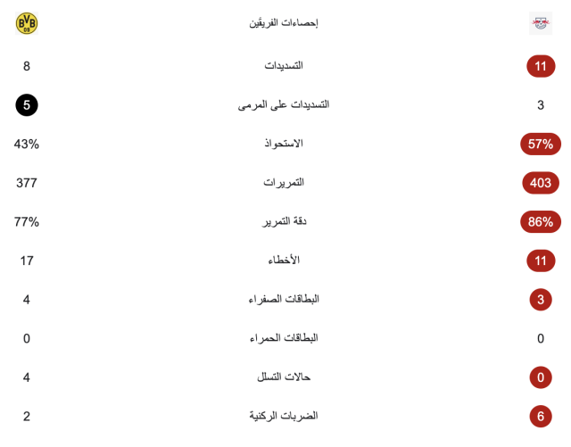ولكن إحصائيات المباراة جاءت لتشير إلى تفوق لايبزيغ على منافسه في كل شيء ما عدا التسديدات على المرمى.