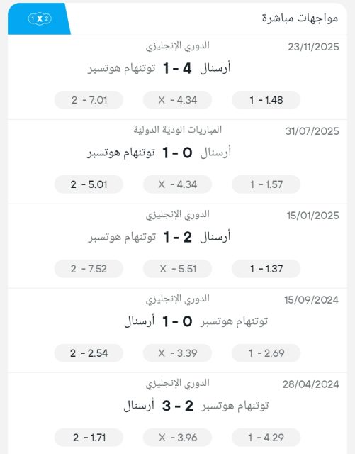 نتائج آخر خمس مباريات بين توتنهام وارسنال