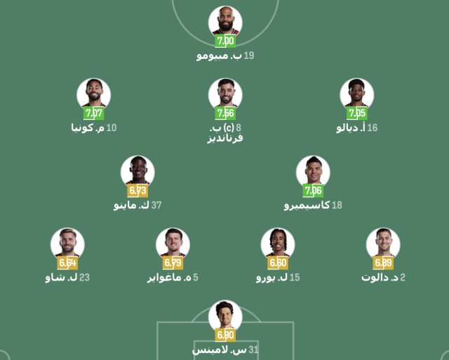 وجاءت تشكيلة اليونايتد لتشهد تواجد برايان مبيومو في الهجوم وحيدًا مع تواجد بنجامين سيسكو على دكة البدلاء.