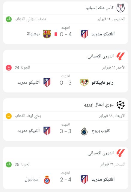 وجاءت نتائج أتلتيكو مدريد كالتالي :