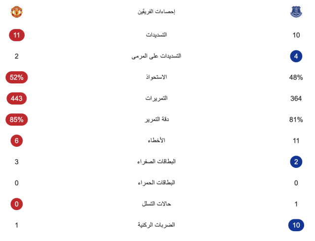 وجاء هدف اليونايتد الوحيد عن طريق بنجامين سيسكو في الدقيقة 71، ليرفع بذلك رصيد فريقه إلى 48 نقطة في المركز الرابع بجدول الترتيب العام، بينما توقف رصيد إيفرتون عند 37 نقطة في المركز التاسع.