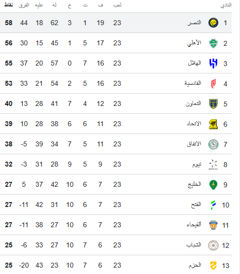 ترتيب دوري روشن بعد فوز النصر على النجمة 5-0