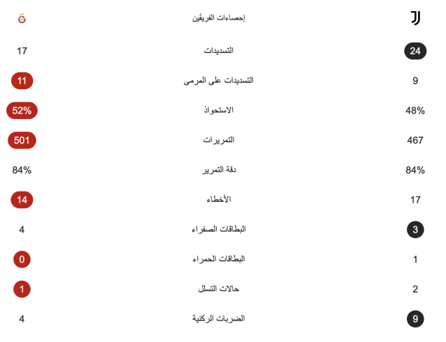 حصل اللاعب لويد كايلي من يوفنتوس على بطاقة حمراء في الدقيقة 48.