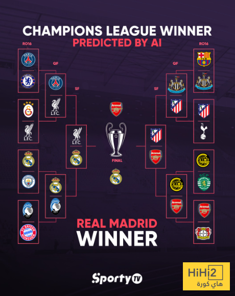 توقع الذكاء الاصطناعي انتصار ريال مدريد على مانشستر سيتي في دور الـ16 ثم على أتالانتا في ربع النهائي، ومن بعده ليفربول في نصف النهائي وأخيرا أرسنال في النهائي.