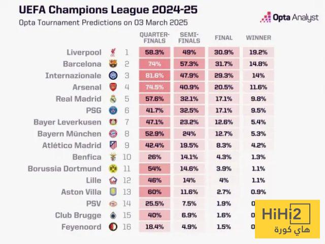 بكل تأكيد الذكاء الاصطناعي لا يعلم الغيب ولا يمتلك السلوك الخارق ليحدد كل شيء …! في الموسم الماضي رشح ليفربول وتوج بها باريس وفي هذا الموسم يرشح الارسنال ولا نعلم من سيتوج بالبطولة الاصعب .