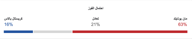 نسبة فوز مانشستر يونايتد 63%، ونسبة فوز كريستال بالاس 16%، ونسبة التعادل 21%.