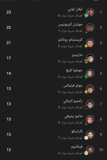 هاي كورة – يتصدر المهاجم الإنجليزي إيفان توني ، لاعب النادي الأهلي ، قائمة هدافي دوري روشن السعودي للمحترفين هذا الموسم ، يليه مباشرة الثنائي جوليان كينيونيس وكريستيانو رونالدو .