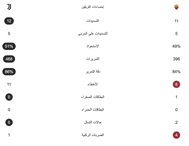 وعلى الرغم من تقاسم الفريقين للنقاط، لكن يوفنتوس استطاع أن يكون الطرف الأفضل في المباراة من خلال التسديدات على المرمى والاستحواذ على الكرة.