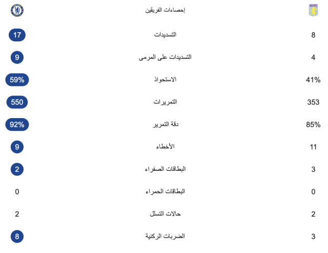 وبهذه النتيجة رفع تشيلسي رصيده من النقاط إلى 48 نقطة ليصبح في المركز الخامس بجدول الترتيب العام، بينما توقف رصيد أستون فيلا عند 51 نقطة في المركز الرابع.