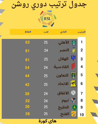 ترتيب دوري روشن عقب فوز الأهلي والهلال