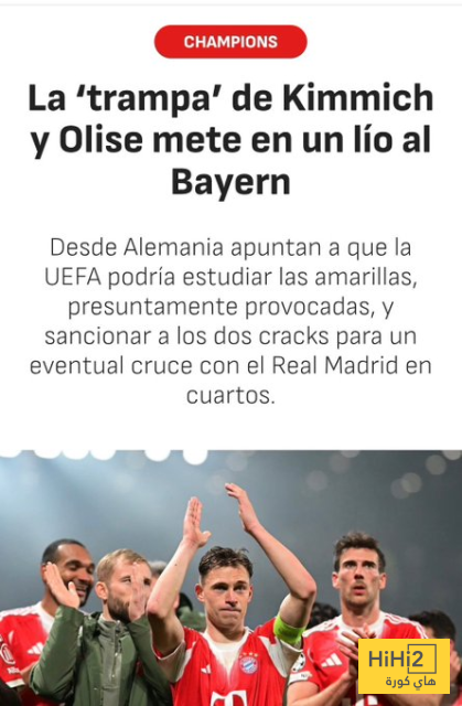 تشير تقارير من ألمانيا الى أن الاتحاد الاوروبي لكرة القدم ” يويفا ” قد يعيد النظر في البطاقات الصفراء التي تلقاها مايكل اوليس وجوشوا كيميتش ، ثنائي بايرن ميونخ ، مما قد يعرض مشاركة اللاعبين في مباراة ربع النهائي المحتملة ضد ريال مدريد للخطر .