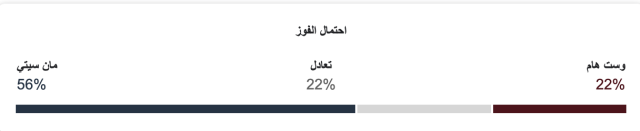 نسبة فوز مانشستر سيتي 56%، ونسبة فوز وست هام يونايتد 22%، ونسبة التعادل 22%.
