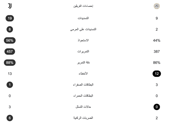 وجاء هدف السيدة العجوز الوحيد عن طريق جيريمي بوجا في الدقيقة 38، ليرفع يوفنتوس رصيده من النقاط إلى 53 نقطة في المركز الرابع، فيما توقف رصيد أودينيزي عند 36 نقطة في المركز الحادي عشر.