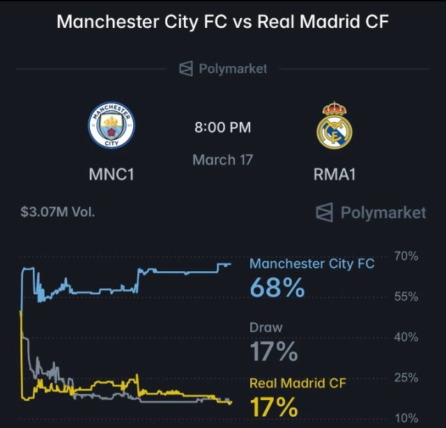 وفقًا لموقع Polymarket Sport ، فإن نسبة فوز ريال مدريد على مانشستر سيتي تصل إلى 17٪ ، مقابل 68٪ السيتي ، و 17٪ نسبة التعادل .