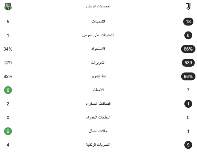 وبهذه النتيجة أصبح رصيد يوفنتوس 54 نقطة في المركز السادس بجدول الترتيب العام، بينما توقف رصيد ساسولو عند 39 نقطة في المركز العاشر.