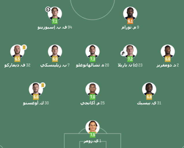 وحصل الحارس يان سومر على التقييم الأعلى بين زملائه من موقع سوفا سكور بعدما ذاد عن مرماه وحفاظ على شباكه نظيفة.
