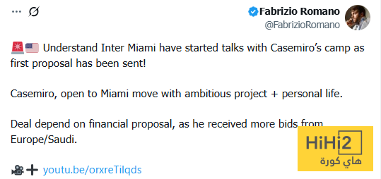 : ” كاسيميرو منفتح على العرض بسبب مخططات النادي المستقبلية وأيضا نمط الحياة في ميامي ، ومرحلة إتمام الصفقة ستعتمد على العرض المالي ، حيث تلقى اللاعب عروضاً أخرى من أندية أوروبية وأخرى سعودية ” .
