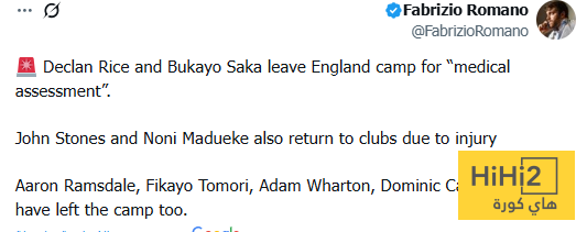 : ” غادر ديكلان رايس وبوكايو ساكا من معسكر إنجلترا لإجراء فحص طبي ، كما عاد جون ستونز ونوني مادويكي إلى أنديتهما بسبب الإصابة ” .