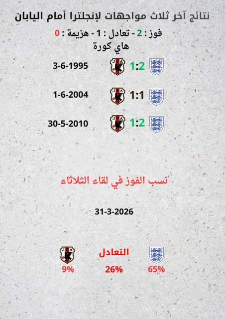المنتخب الإنجليزي يمتلك الأفضلية في نتائج المواجهات الأخيرة ونسب الفوز أمام نظيره الياباني ، قبل المباراة التي تنطلق في الساعة 9:45 مساءً بتوقيت مكة المكرمة .