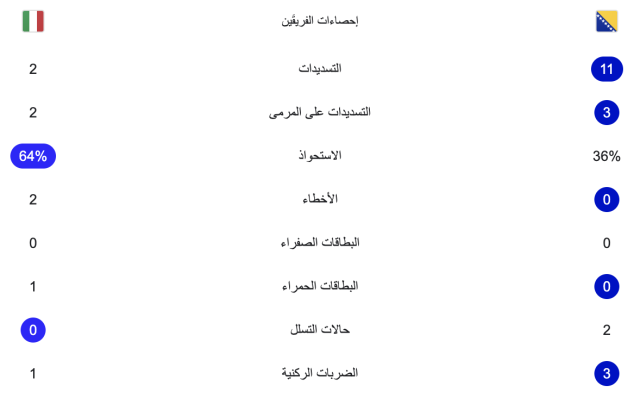 الشوط الأول – إحصائيات مباراة إيطاليا والبوسنة والهرسك
