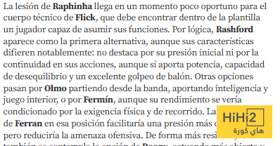 تأتي إصابة رافينيا في وقت غير مناسب تماما للجهاز الفني بقيادة فليك ، الذي يتعين عليه إيجاد لاعب من داخل الفريق قادر على أداء دوره . منطقيا ، يبدو راشفورد الخيار الأول على الرغم من اختلاف خصائصه بشكل كبير .. فهو لا يتميز بالضغط الهجومي الأولي أو المشاركة المستمرة مع أنه يمتلك القوة والقدرة على زعزعة دفاعات الخصوم ، بالإضافة إلى تسديده الممتاز