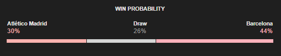 نسبة فوز برشلونة 44 % ، التعادل 26 % ، الخسارة 30 %.