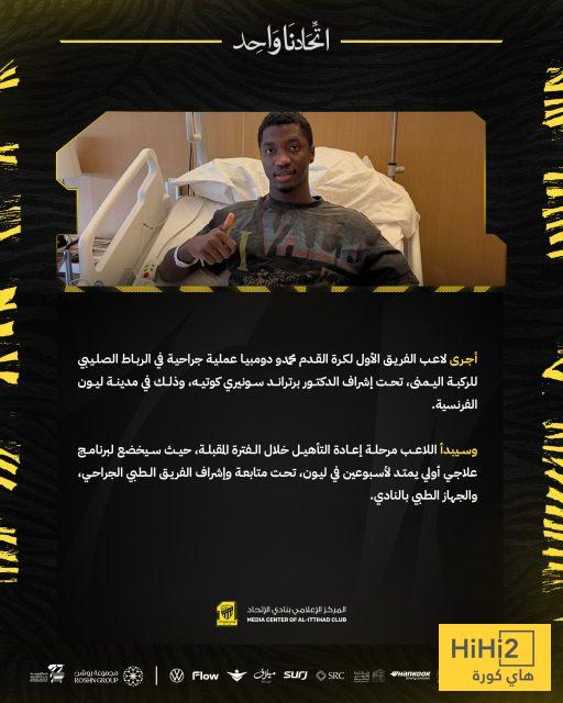 أعلن نادي الاتحاد السعودي أن لاعبه المالي محمدو دومبيا خضع لجراحة ناجحة في الرباط الصليبي الأمامي للركبة اليمنى اليوم في مدينة ليون الفرنسية. وأكد النادي أن اللاعب سيبدأ مرحلة إعادة التأهيل في فرنسا لمدة أسبوعين تحت إشراف الطاقم الطبي، تمهيدًا لعودته تدريجيًا للملاعب.