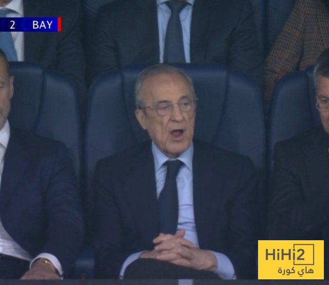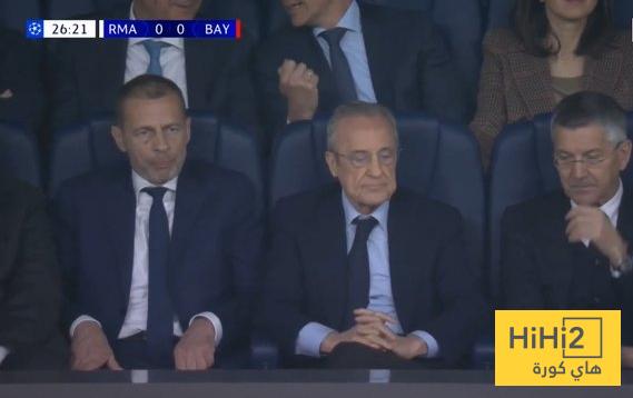 رئيس ريال مدريد يتابع المباراة من المنصة الشرفية بجانب رئيس الاتحاد الاوروبي ألكسندر تشيفرين ، وتظهر ملامح الغضب والامتعاض على وجه بيريز من اداء لاعبيه ضد الفريق البافاري .