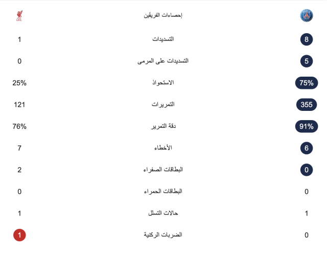 انتهى الشوط الأول من مباراة باريس سان جيرمان وليفربول في ذهاب الدور ربع النهائي بدوري أبطال أوروبا.