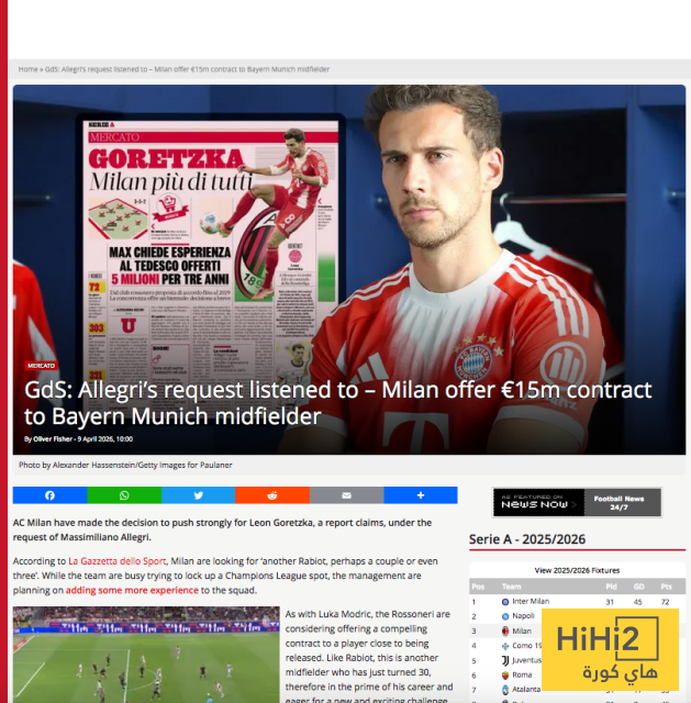 يخطط نادي ميلان لتعزيز وسط ملعبه بضم الألماني ليون جوريتسكا من بايرن ميونخ الصيف المقبل، بناءً على طلب المدرب ماسيميليانو أليجري.