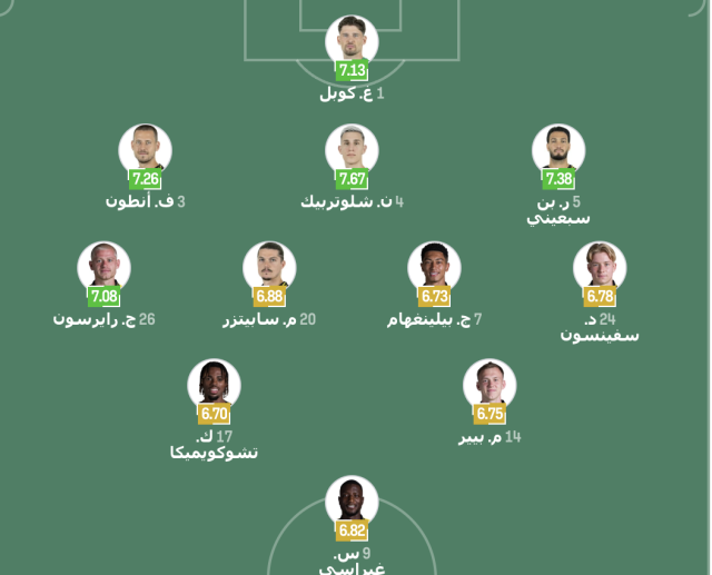 خط الوسط: جوليان رايرسون – مارسيل سابيتزر – جوب بيلينغهام – دانيال سفينسون – كارني تشوكويميكا – ماكسيميليان بيير.