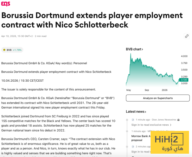أعلن نادي بوروسيا دورتموند الألماني، رسميًا، تمديد عقد مدافعه الدولي نيكو شلوتربيك حتى عام 2031، في خطوة تؤكد تمسكه باللاعب، وإبعاده عن اهتمام الأندية الأوروبية الكبرى، وعلى رأسها ريال مدريد.