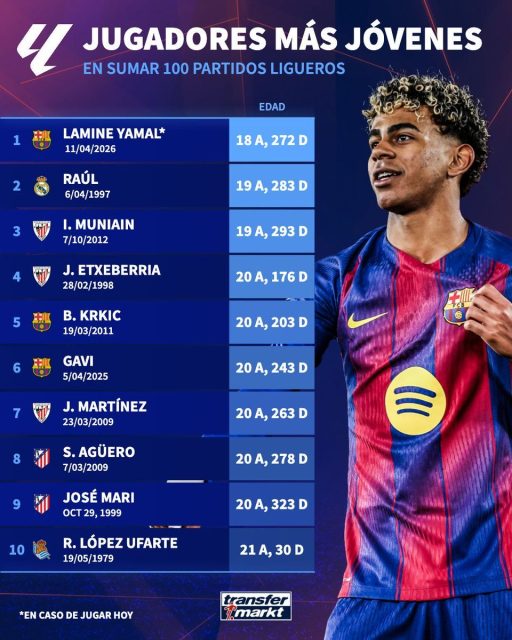 أصبح نجم برشلونة الشاب ، لامين يامال ، أصغر لاعب يصل إلى 100 مباراة في الدوري الإسباني ، وذلك بعمر 18 عام و272 يوم .