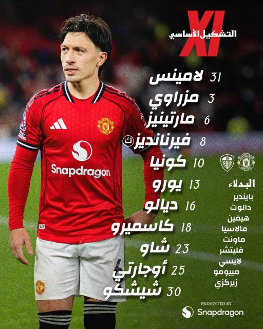 أعلن مانشستر يونايتد عن تشكيلته الرسمية لمباراة ليدز يونايتد التي ستقام الليلة في ختام الجولة الثانية والثلاثين من الدوري الإنجليزي الممتاز.