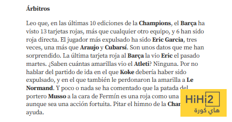 اللاعب الأكثر حصولا على البطاقات الحمراء هو إريك غارسيا  بثلاث بطاقات متفوقا ببطاقة واحدة على أراوخو وكوبارسي ، هذه إحصائيات أدهشتني .. هل تعلم كم عدد البطاقات الصفراء التي تلقاها أتلتيكو مدريد ؟ لا شيء ناهيك عن مباراة الذهاب التي كان ينبغي فيها طرد كوكي ، والتي نجا فيها لو نورماند أيضا من بطاقة صفراء ولم يذكر إلا القليل جدا عن حقيقة أن ركلة الحارس موسو لوجه فيرمين ، كانت تستحق بطاقة حمراء واضحة حتى وإن كانت خطأ غير مقصود .