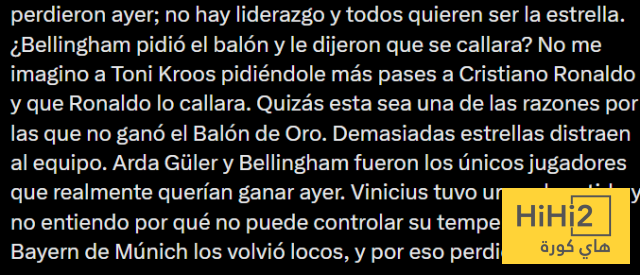 هذا هو السبب في خسارة الريال بالأمس ، لا توجد قيادة والكل يريد أن يكون هو النجم الأول ، بيلينغهام طلب الكرة وأنت تطلب منه السكوت؟ لا يمكنني أن أتخيل كروس يطلب من كريستيانو رونالدو التمرير أكثر ثم يقوم رونالدو بإسكاته ، ربما يكون هذا أحد الأسباب التي حالت دون فوزه بالكرة الذهبية .