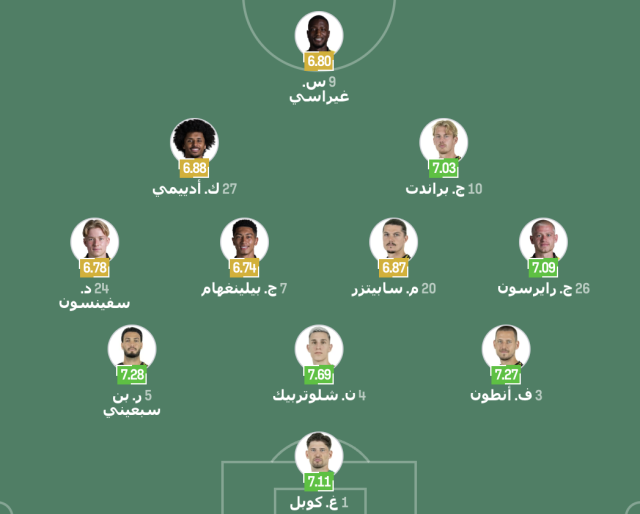 خط الوسط: جوليان رايرسون – مارسيل سابيتزر – جوب بيلينغهام – دانيال سفينسون – جوليان براندات – كريم أديمي.