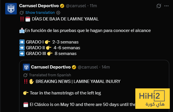 اكدت اذاعة كادينا سير الاسبانية اصابة لامين يامال نجم برشلونة بتمزق في اوتار الركبة في قدمة اليسرى .